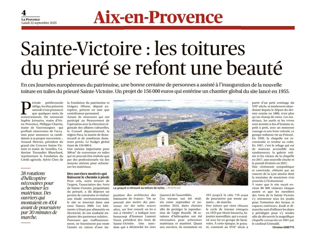 Dans le cadre des Journées européennes du Patrimoine et moins d’un an après l’achèvement des travaux de remplacement des toitures du Prieuré, les Amis de Sainte-victoire ont organisé une belle journée, se déroulant ainsi :