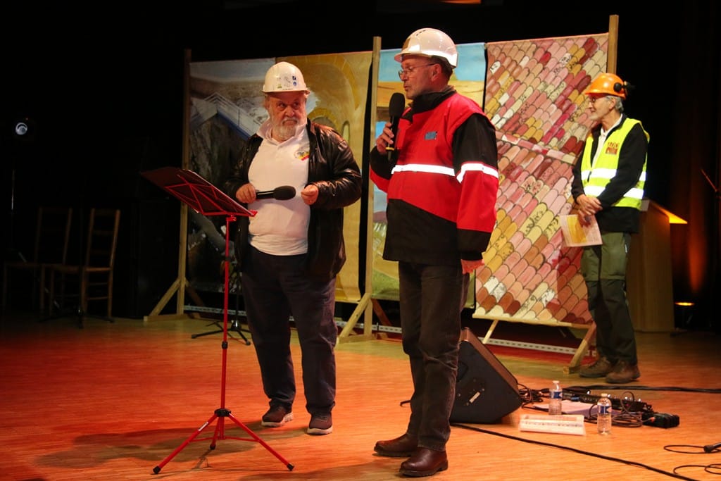 – 8 présentations des derniers grands travaux par des bénévoles, devant de grands panneaux peints, déroulés à mesure.